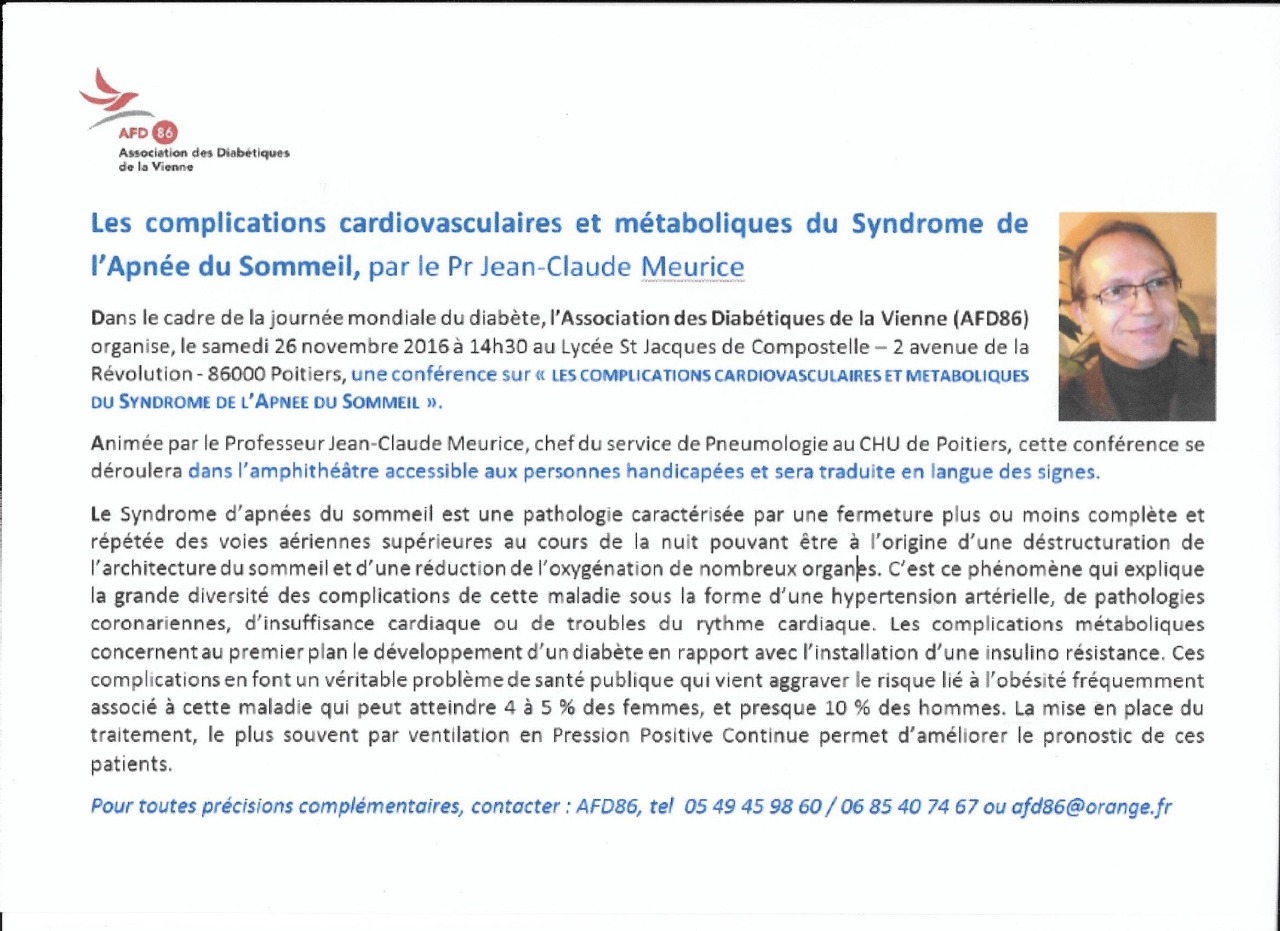 Samedi 26 novembre 2016 à 14:30 à POITIERS ___ Conference du Pr.MEURICE sur les complications liées aux APNEES du sommeil.